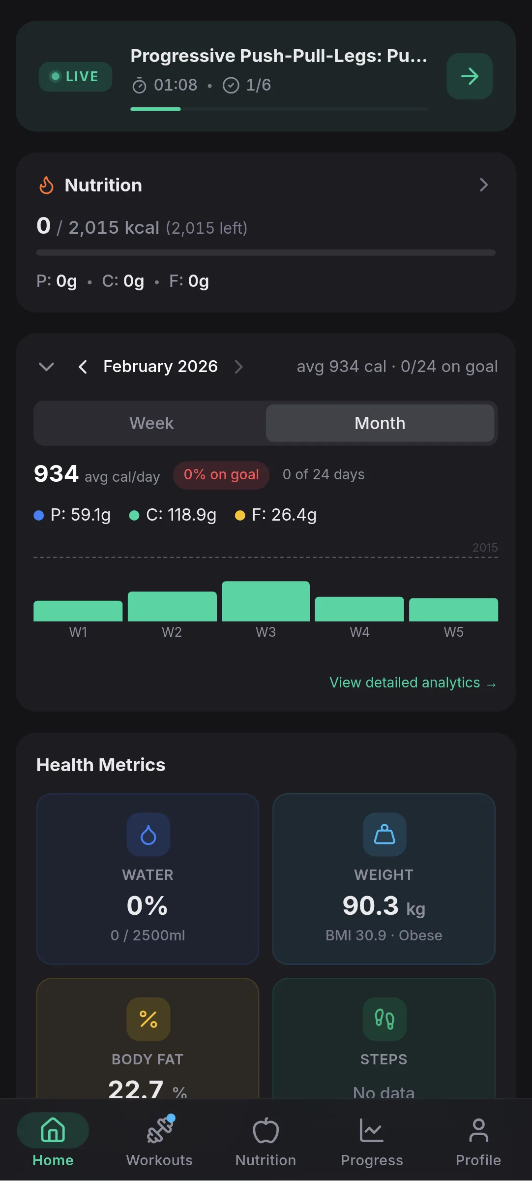 Three dedicated dashboards give you deep insights into nutrition trends, workout progression, and body composition changes. From 7-day snapshots to all-time views.